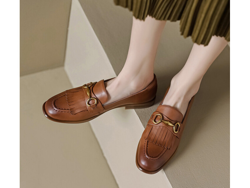 • Natural Leather Metal Chain Loafers Woman Brand Designer Tassel Slip-on Flat Shoes Lady Daily Leisure Flats Fashion New